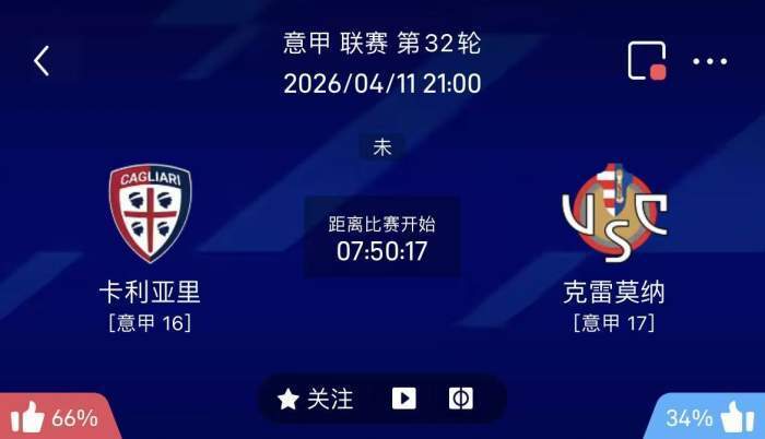 周六011意甲联赛:卡利亚里VS克雷莫纳 比赛时间:2026-04-11 21:00